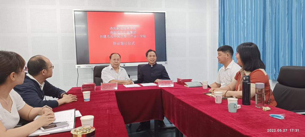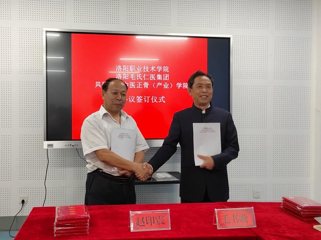 527日,我校医学院与洛阳毛氏仁医中医药发展有限公司(以下简称毛氏仁医集团)在伊滨校区2号实训楼318会议室举行共建毛氏中医正骨(产业)学院合作协议签订仪式。医学院院长赵印震,毛氏仁医集团领军人 全国名老中医毛书歌教授出席签约仪式。